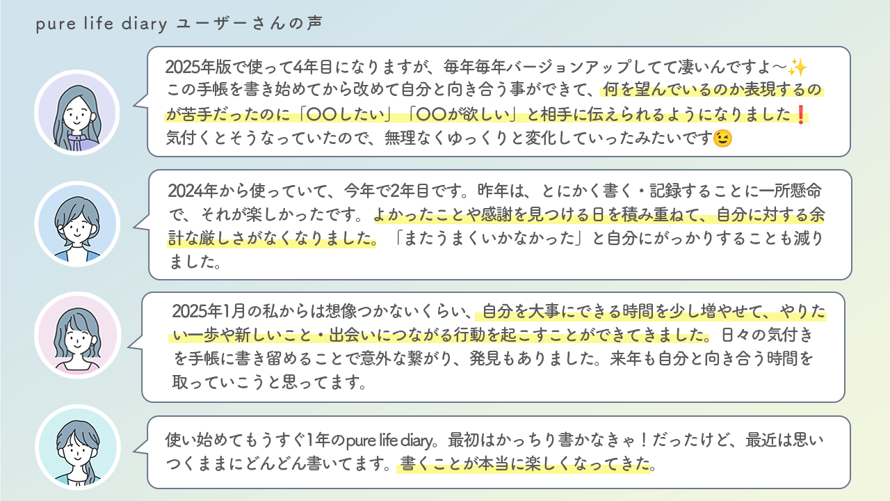 pure life diaryをご愛用いただいているユーザーのみなさまの声