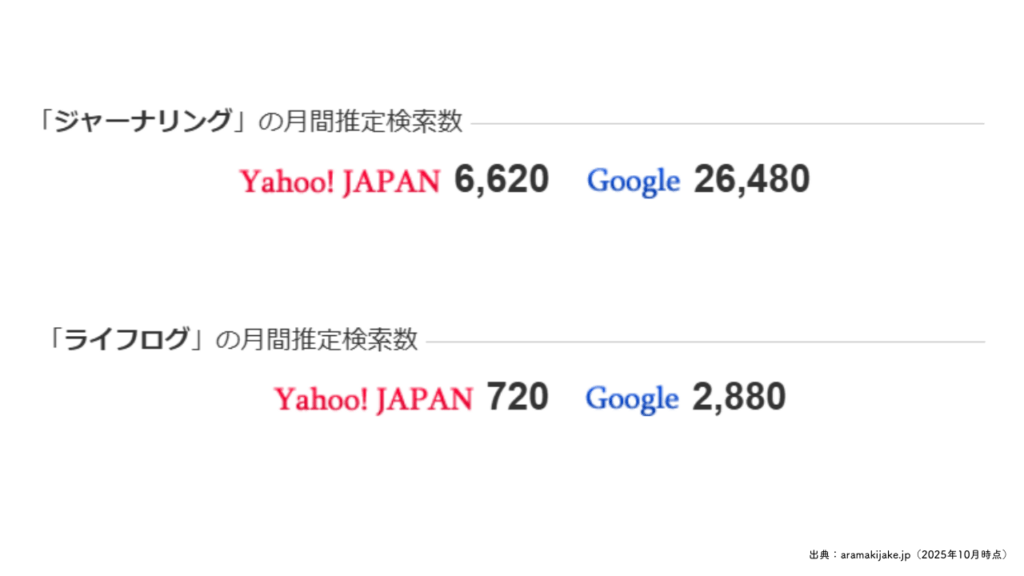 月間検索ボリュームも「ライフログ」が約3,500回に対し、「ジャーナリング」は3万回以上。