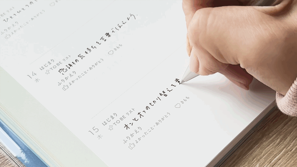 ネガティブな出来事があっても、“よかったこと”や“感謝できたこと”を見つけて書くと、脳の焦点が「できなかったこと」から「できたこと」「満たされていること」へと切り替わり、自然と自分にやさしくなれます。